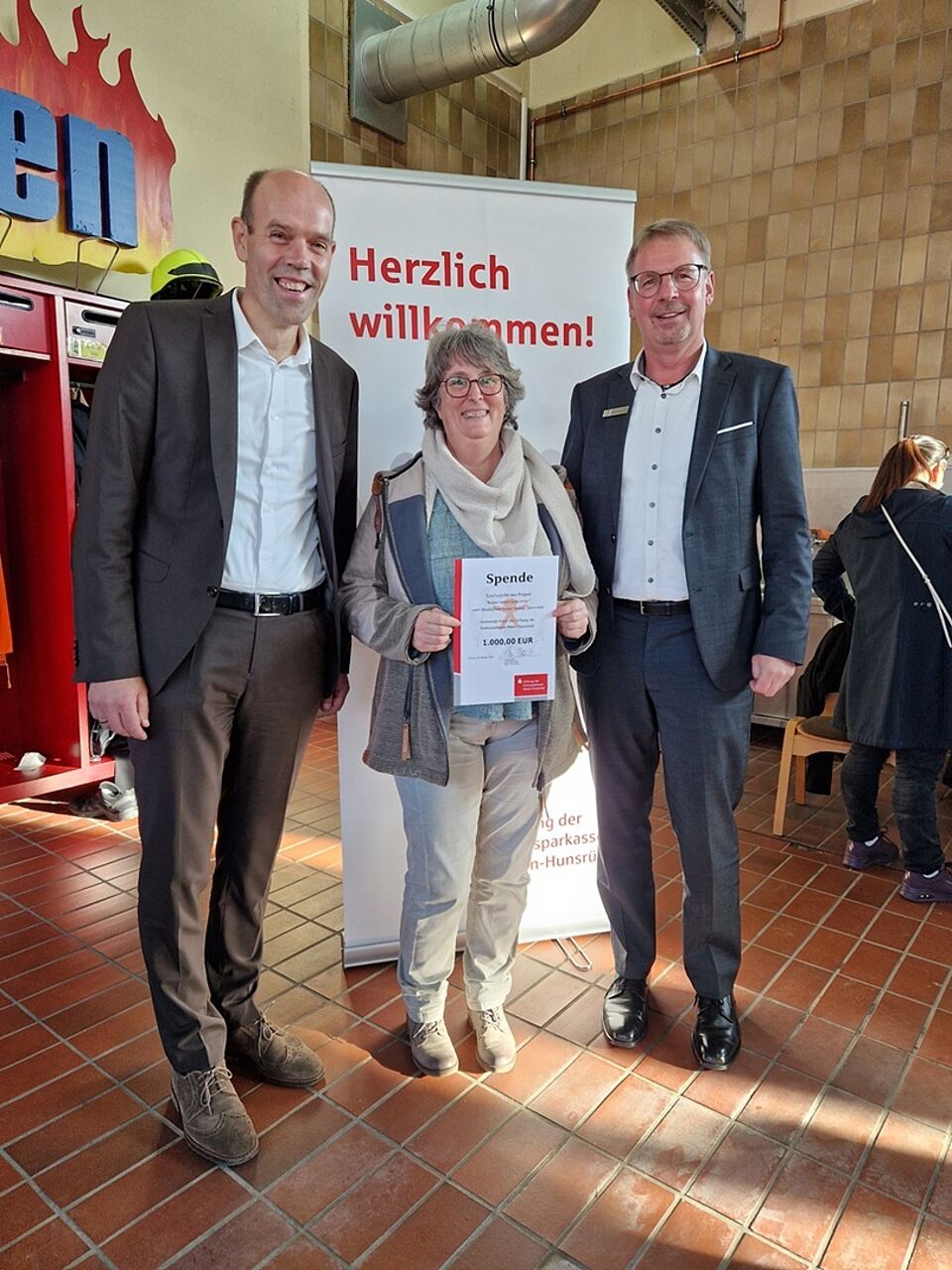 Die Sparkassenstiftung der Kreissparkasse Rhein-Hunsrück ist eine segensreiche Einrichtung. Mit ihrem Stiftungskapital fördert sie bekanntlich viele sinnvolle Projekte in der Region. So auch das Projekt „Kunst kennt kein Alter“ der Tagespflege des DRK-Kreisverbands Rhein-Hunsrück e.V. in Simmern. Dieser Tage fand in den Räumlichkeiten der Freiwilligen Feuerwehr Rheinböllen die feierliche Übergabe einer Spende von 1000 EUR ans Rote Kreuz durch die Sparkassenstiftung statt. DRK-Kreisgeschäftsführer Thomas Bollig und Silke Kretzschmar, DRK-Mitarbeiterin Tagespflege und Projektmitarbeiterin, nahmen den Scheck entgegen und bedankten sich für die großzügige Unterstützung durch die Stiftung. Beide richteten Dankesworte an das Plenum. Bei Kaffee und Kuchen gab es reichlich gute Gesprächen und einen angeregten Gedankenaustausch. Umrahmt wurde die Spendenübergabe durch festliche Geigenklänge. Zudem nutzten Thomas Bollig und Silke Kretzschmar die Gelegenheit, für die Vernissage zum Projekt „Kunst kennt kein Alter“ in der Tagespflege-Einrichtung in der Poststraße von Simmern zu werben.